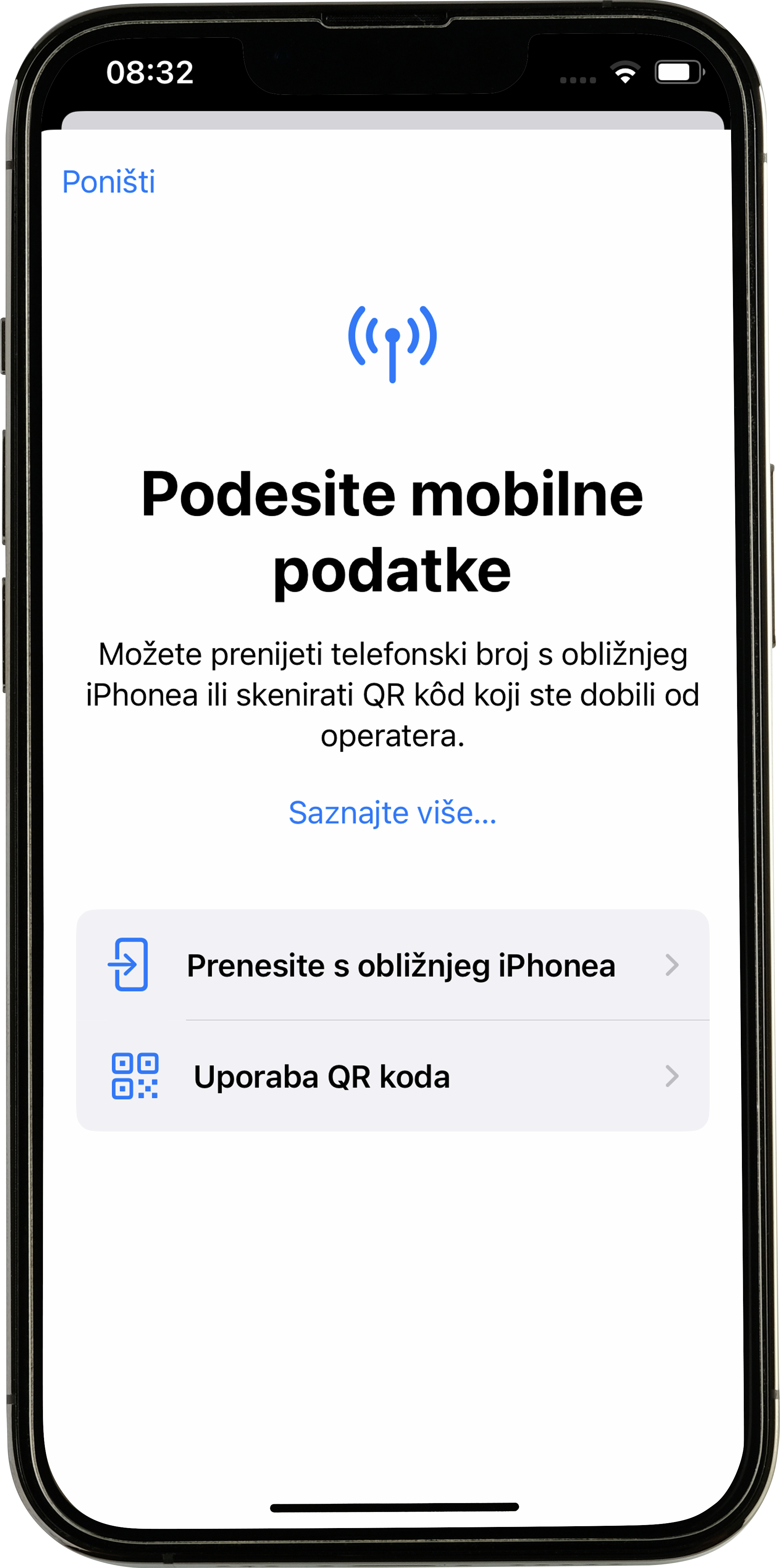 3. Odaberite „Uporaba QR koda“. Skenirajte QR kod s eSIM kartice. Pričekajte dok se eSIM ne preuzme na uređaj.